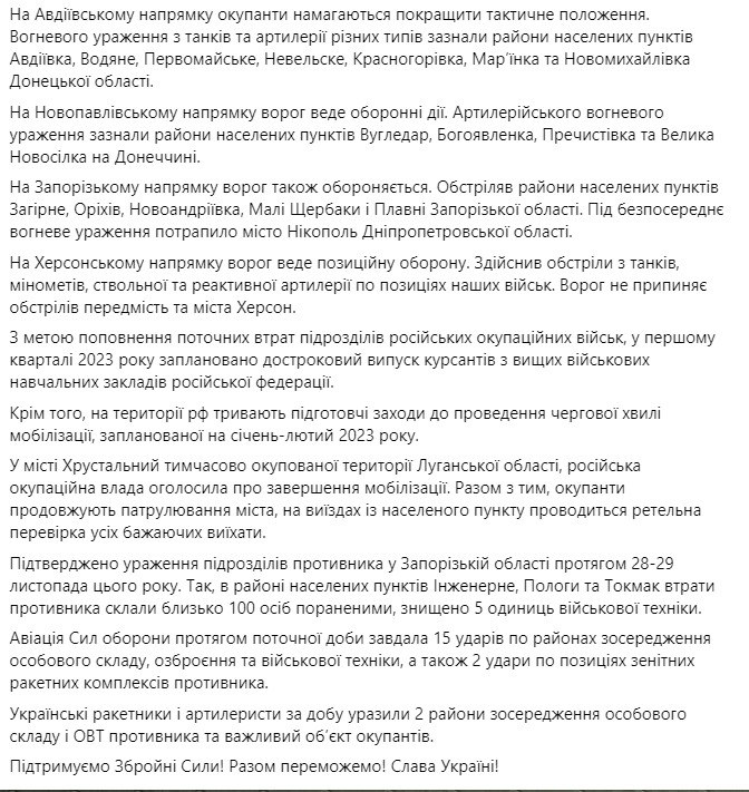 "На кадрах с геолокацией, опубликованных 29 ноября, видно, что российские войска продвигались к юго-восточным окраинам Бахмута", - сообщается в утренней сводке организации.