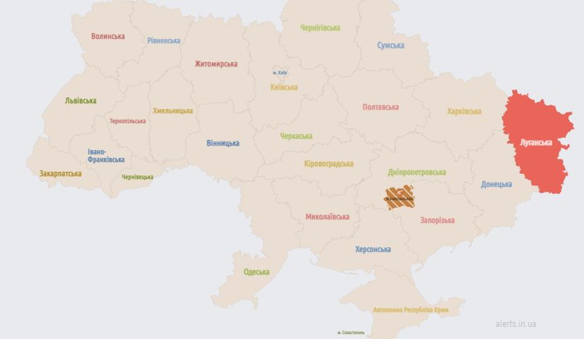 06.10 Карта тревог на сейчас. Воздушная тревога в Луганской области, угроза артобстрела в Днепропетровской.