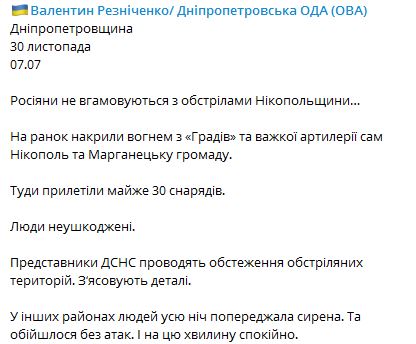 07.45 Утром россияне накрыли огнем из "Градов" и тяжелой артиллерии Никополь и Марганецкую громаду. Туда прилетели около 30 снарядов.