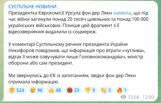 Спикер президента Сергей Никифоров заявил "Суспильному", что информация о потерях является "чувствительной", поэтому озвучивать ее может главнокомандующий, министр обороны и президент.