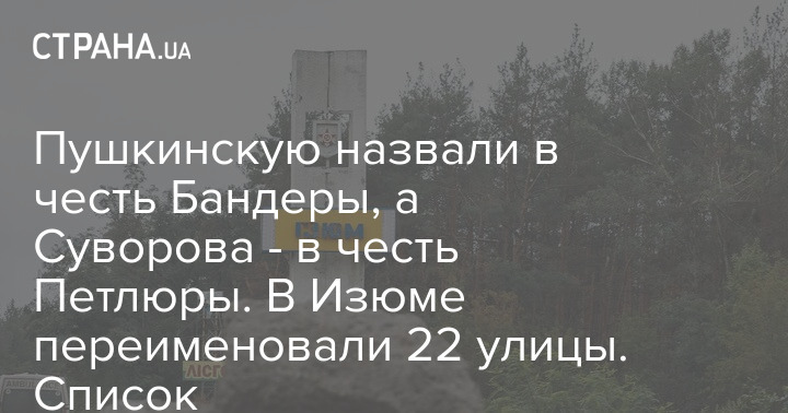 Пушкинскую назвали в честь Бандеры, а Суворова - в честь Петлюры. В Изюме переименовали 22 улицы. Список