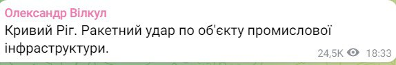 18:35 Глава военной администрации Кривого Рога Александр Вилкул подтвердил ракетный удар по Кривому Рогу.