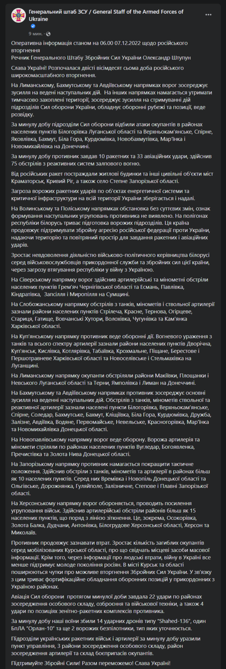 Утром в среду, 7 декабря, Генштаб ВСУ опубликовал актуальную сводку с фронта. Сообщается, что россияне сосредотачивают усилия на ведении наступления на Лиманском, Бахмутском и Авдеевском направлениях.