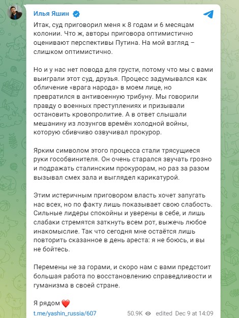 "Итак, суд приговорил меня к 8 годам и 6 месяцам колонии", - написал Яшин.