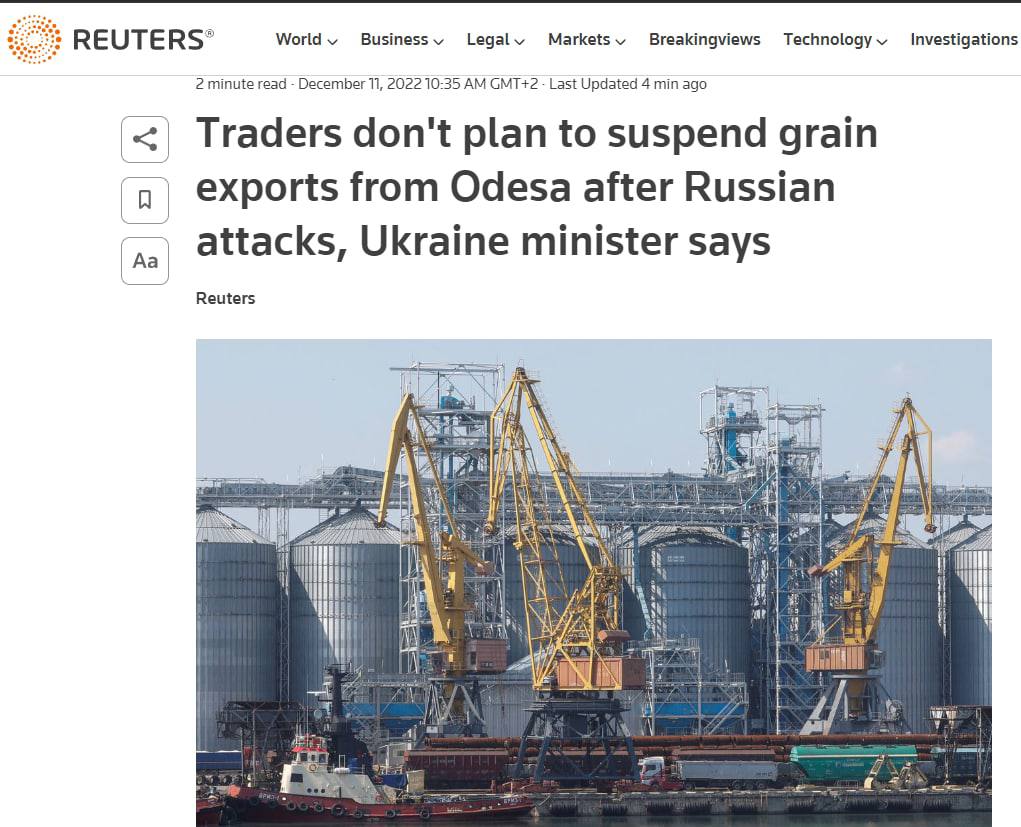 Украина не планирует останавливать поставки зерна из портов в Одессе из-за повреждения объектов энергосистемы региона.