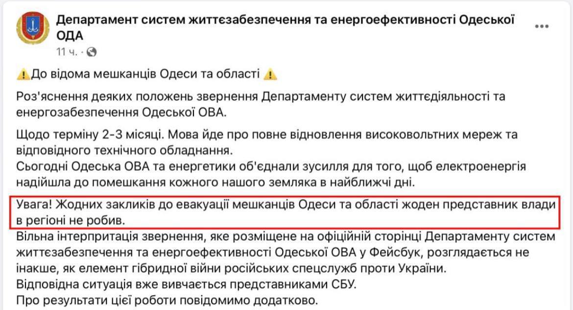 Но сегодня этот пост удалили. А вместо него опубликовали новый - с заверениями, что людей к эвакуации не призывали и никаких апокалиптических сценариев не рисовали. А под "2-3 месяцами" имелось в виду полное восстановление поврежденных объектов.