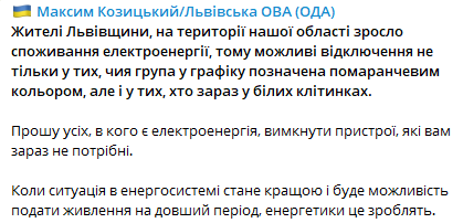 "Жители Львовской области, на территории нашей области возросло потребление электроэнергии, поэтому возможны отключения не только у тех, чья группа в графике отмечена оранжевым цветом, но и у тех, кто сейчас в белых ячейках ", - пишет Козицкий.
