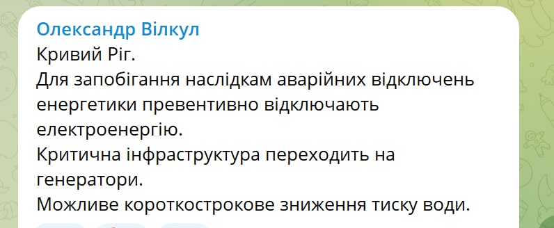 Энергию превентивно отключают и в Кривом Роге. Критическую инфраструктуру переводят на генераторы.