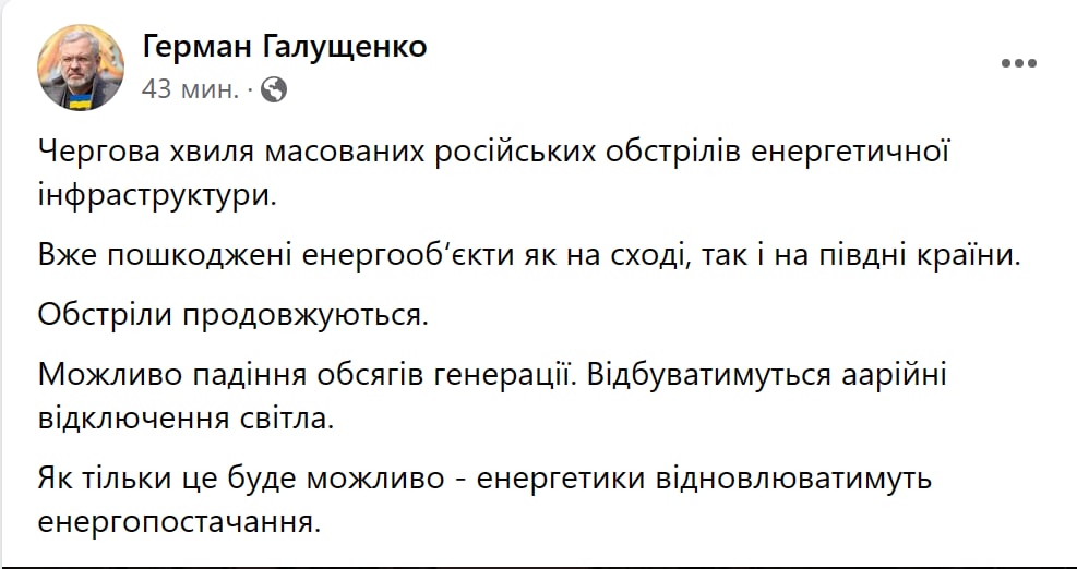 "Возможно падение объемов генерации. Происходят аварийные отключения света", - заявил он.