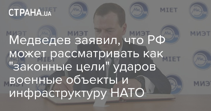 Зампред совбеза РФ Дмитрий Медведев заявил, что Москва может рассматривать в качестве "законных целей" для ударов военные объекты и инфраструктуру (в том числе энергообъекты) стран НАТО, а также их военно-политическое руководство.