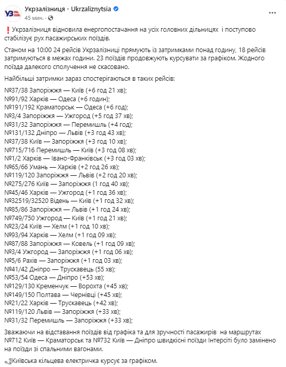 "Укрзализныця" сообщает о возобновлении энергоснабжения на всех главных участках. Однако многие поезда по-прежнему идут с нарушением графика.