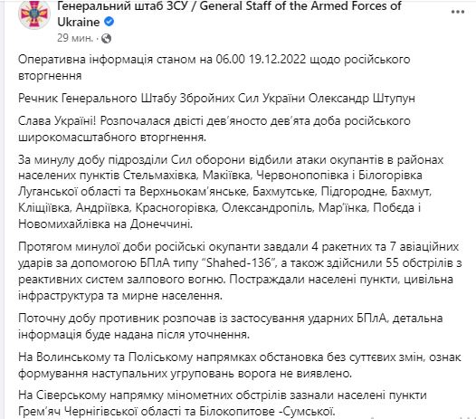 В понедельник, 19 декабря, в Украине идет уже 299-й день войны с РФ.