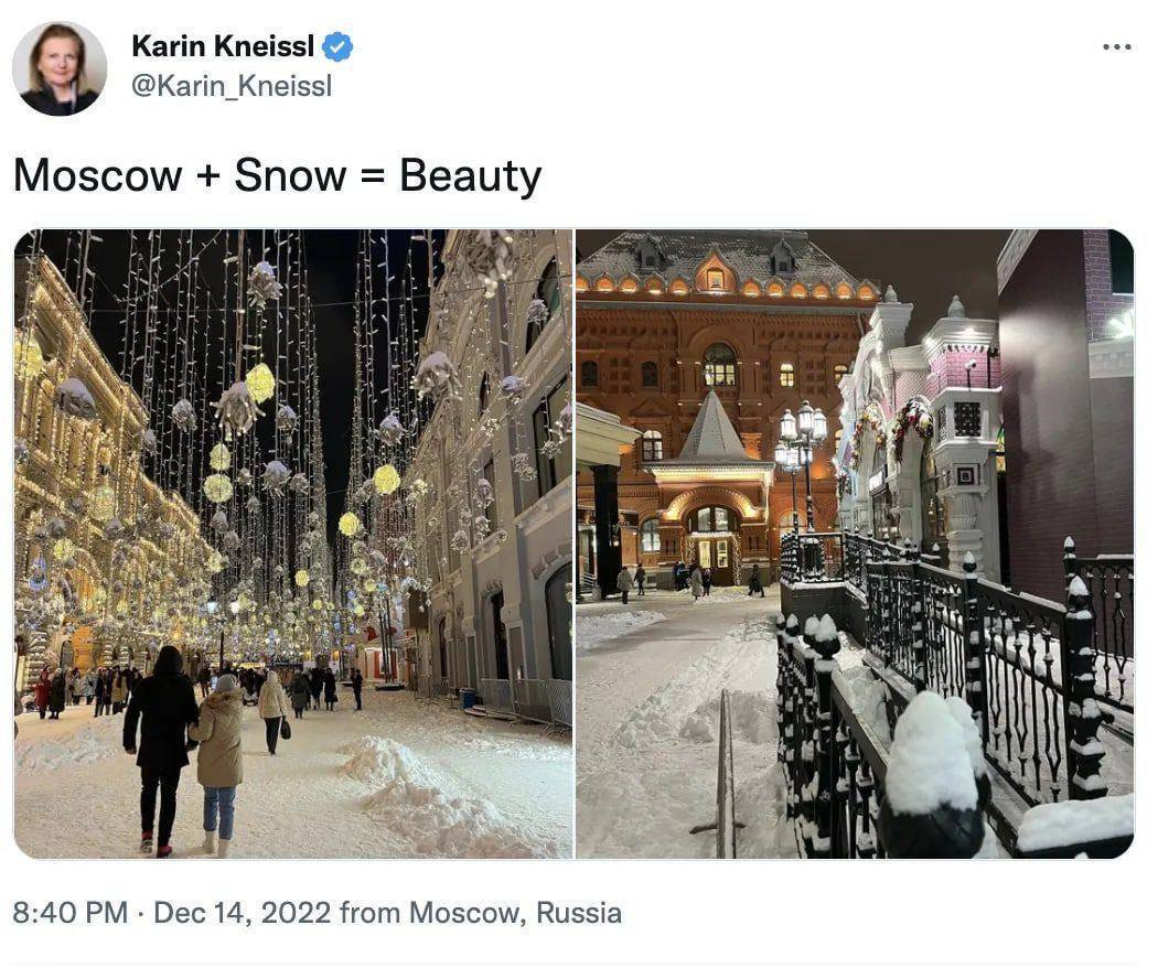 В Твиттере разгорелся новый политический скандал. Экс-глава МИД Австрии Карин Кнайсль на своей странице опубликовала фото заснеженной и украшенной Москвы, восхитившись ее красотой.