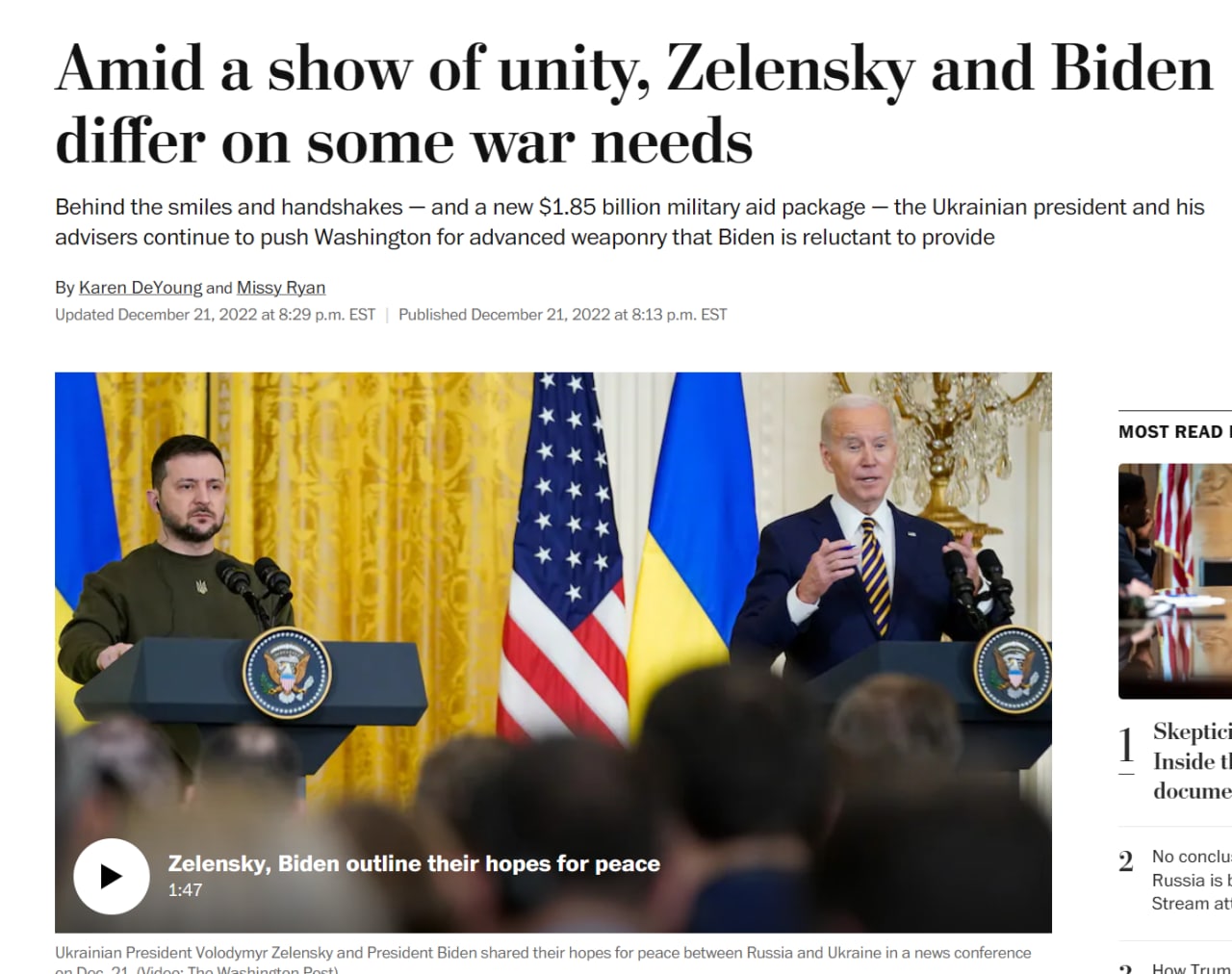 "Украинский президент и его советники продолжают подталкивать Вашингтон к передовым вооружениям, которые Байден не хочет предоставлять", - говорится в статье.