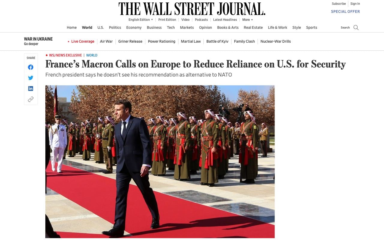 11.03 Макрон призвал Европу меньше полагаться на США в вопросах безопасности - и предоставить России гарантии безопасности в рамках переговоров о прекращении войны в Украине, пишет WSJ.