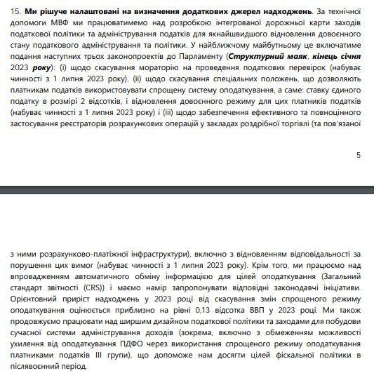 В частности, в Меморандуме есть обязательство Украины отказаться с 1 июля 2023 года от упрошенной налоговой системы, которая позволяла предпринимателям платить всего 2% налогов от оборота.