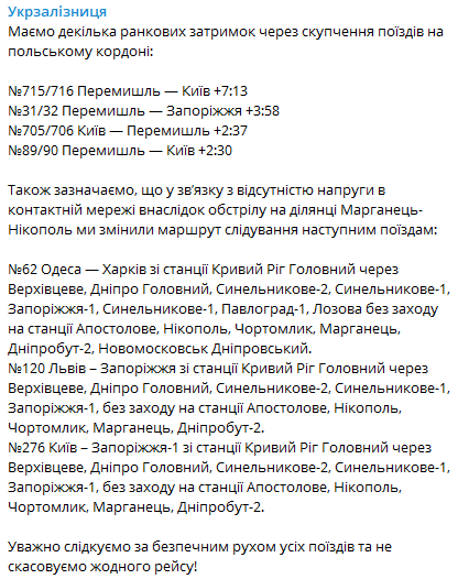 Также в связи с отсутствием напряжения в контактной сети в результате обстрела на участке Марганец-Никополь изменен маршрут следования для следующих поездов: