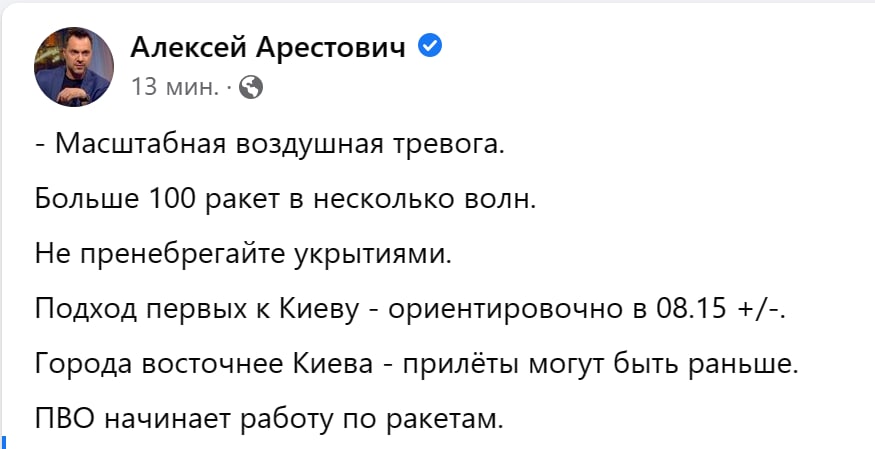 Об этом сообщил советник Офиса президента Алексей Арестович в своем телеграм-канале.