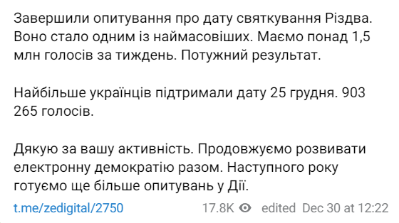 Голосование по дате празднования Рождества, запущенное в "Дие" 24 декабря, завершилось. Из 1,5 млн голосовавших в течение недели более 900 тысяч отдали голос за дату празднования 25 декабря.