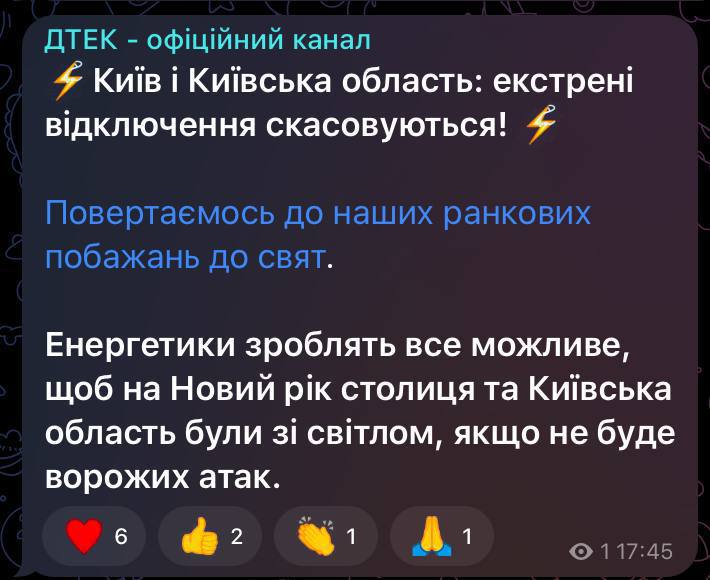 К вечеру 31 декабря экстренные отключения света в Киеве и Киевской области, введенные из-за сегодняшней атаки РФ, отменены.