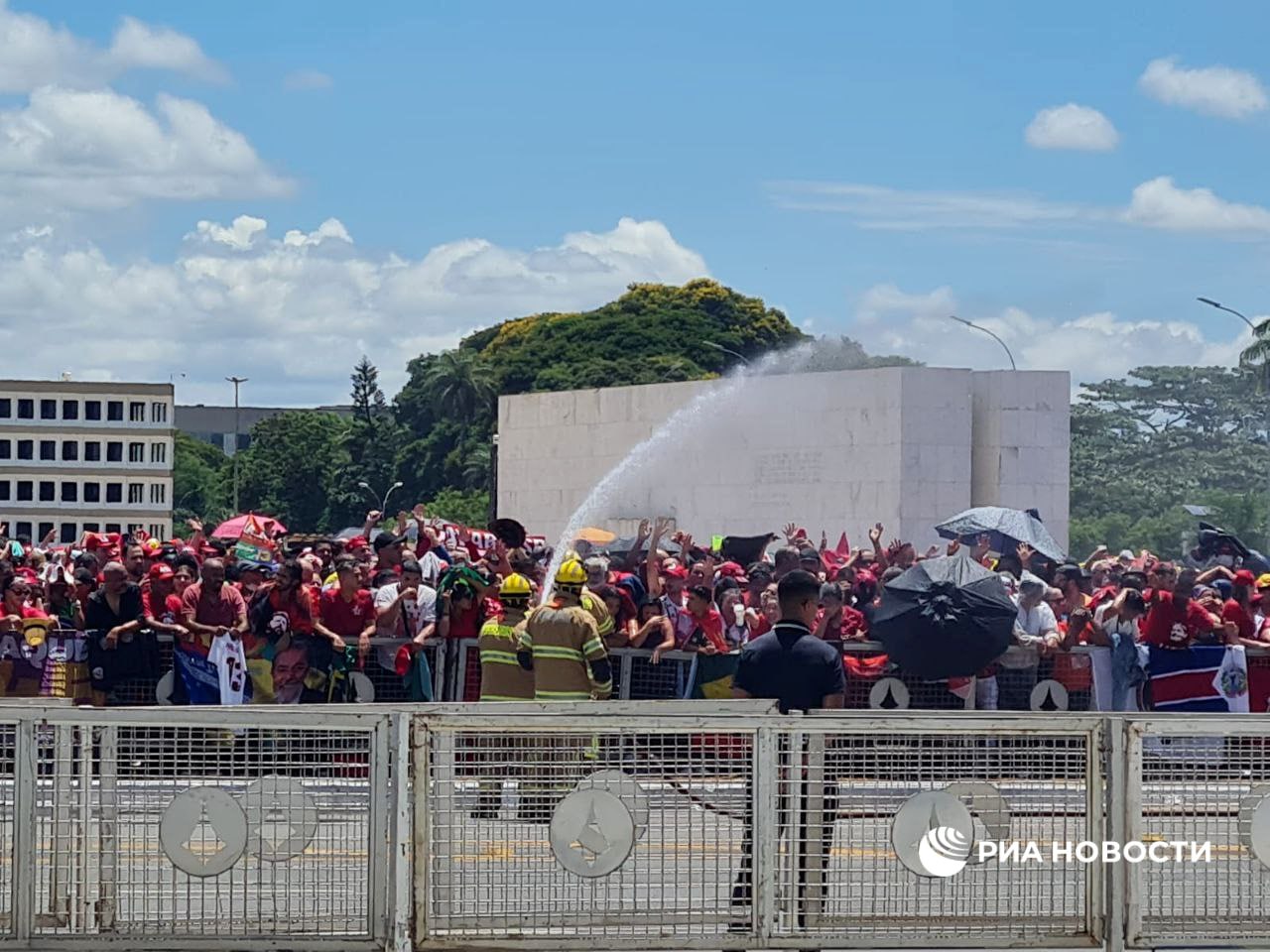 На площади у дворца Планалту в Бразилиа собралась огромная толпа зрителей. Пожарные поливали людей из шлангов из-за жары.