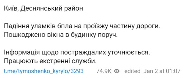 В Деснянском районе Киева ночью беспилотник упал на проезжую часть. В доме рядом выбило окна