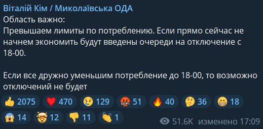 Других отключений пока не планируется. Конечно, если не будет новых атак. Что касается локальных аварийных отключений, то их вероятность остается высокой», – написал Коваленко.
