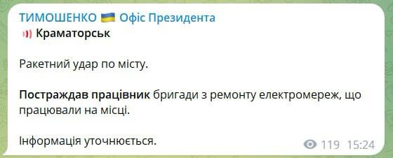 По данным заместителя главы Офиса президента Кирилла Тимошенко, пострадал сотрудник бригады по ремонту электросетей, который работал на месте.