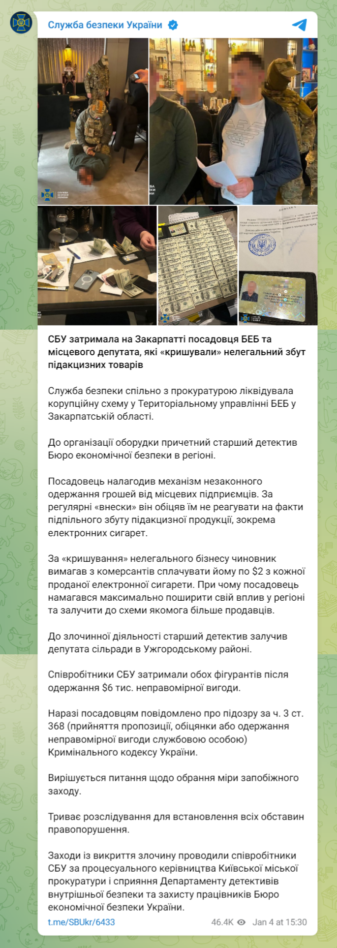 "Чиновник наладил механизм незаконного получения денег от местных предпринимателей. За регулярные взятки он обещал им не реагировать на факты подпольного сбыта подакцизной продукции, в частности электронных сигарет", - говорится в сообщении СБУ.