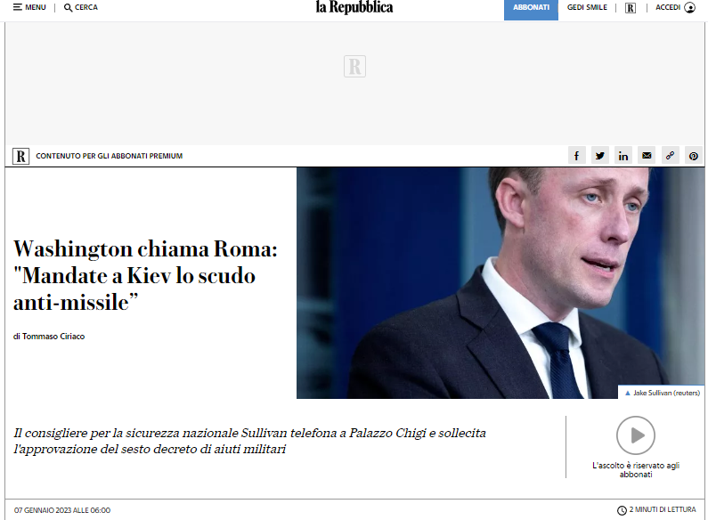 Источники издания в дипломатических кругах сообщили, что вопрос поставок ПВО помощник президента США по национальной безопасности Джейк Салливан и дипломатический советник премьер-министра Италии Франческо Тало обсудили во время телефонного разговора.