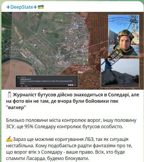 В тоже время, по данным проекта  DeepState, ВСУ контролируют около половины города, а другую половину - россияне. Также DeepState отмечает, что Бутусов действительно находится в Соледаре, но фото его сделано не там, где вчера были "вагнеровцы".