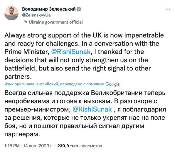 Зеленский поблагодарил Сунака, отметив, что это "посылает правильный сигнал другим партнерам".