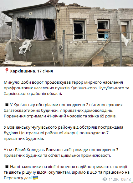 "В Купянске обстрелами повреждены 2 пятиэтажных многоквартирных дома, 7 частных домовладений. Ранения получили 41-летний мужчина и женщина 65 лет. В Волчанске Чугуевского района от обстрелов пострадало здание Центральной районной больницы, повреждены 7 частных домов", - сообщил Синегубов.