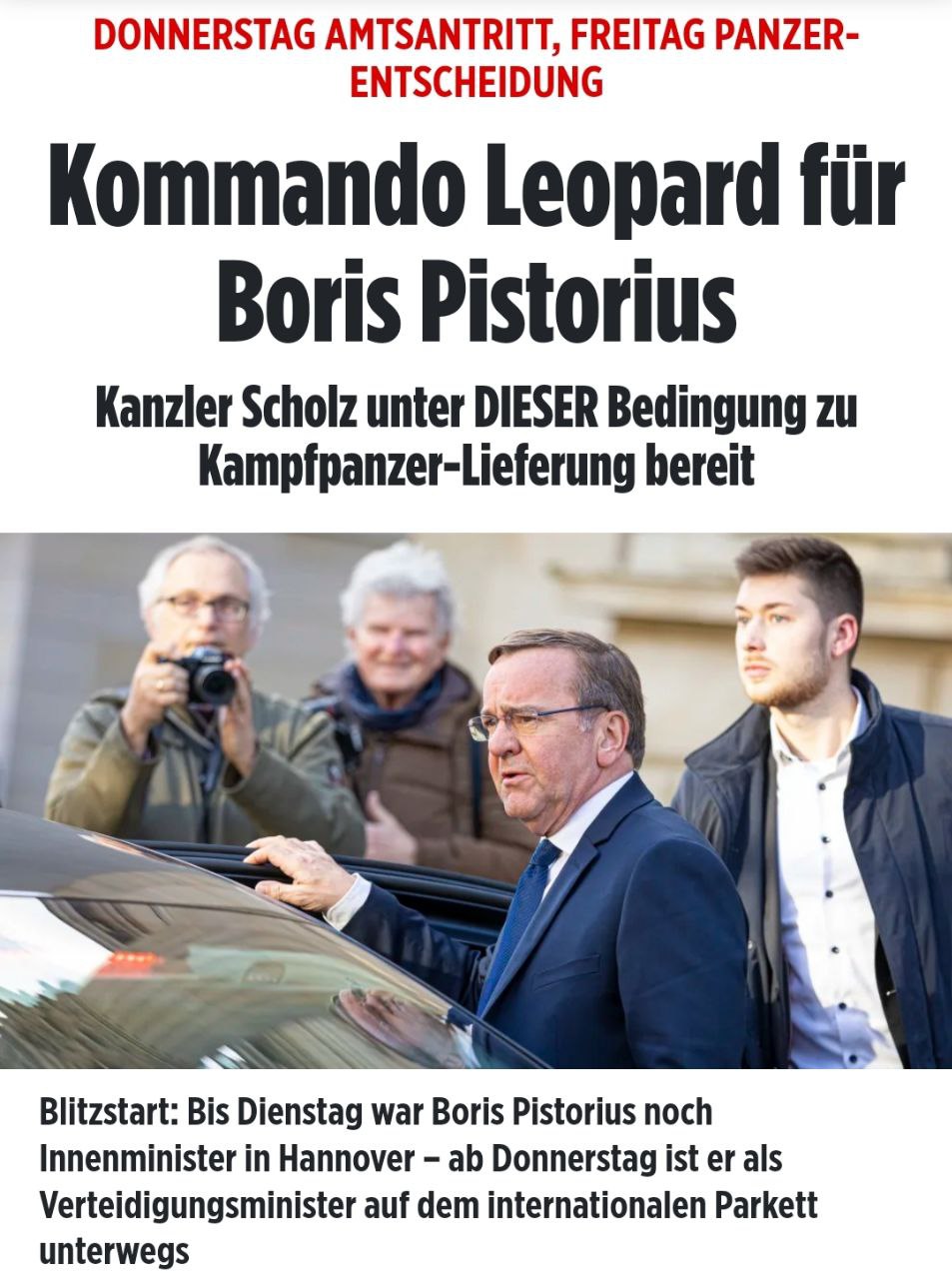 В первой говорится, что во вторник канцлер Олаф Шольц позвонил президенту США Джо Байдену. И, по информации Bild, "ясно дал понять свою позицию "основные боевые танки только вместе".