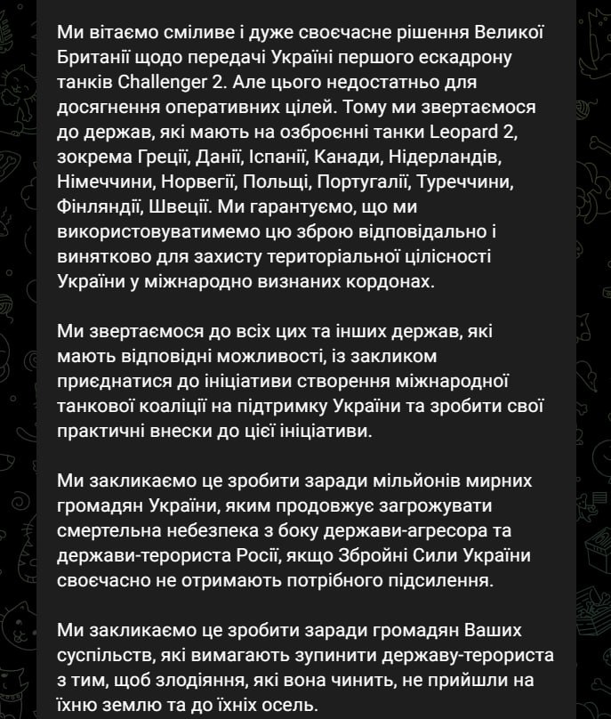 В связи с этим Украина обращается к государствам, имеющим на вооружении танки Leopard 2.
