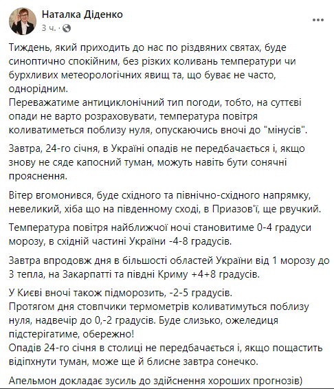 По данным Диденко, сейчас в Украине преобладает антициклонический тип погоды, то есть на существенные осадки не стоит рассчитывать, а температура воздуха будет колебаться около нуля, опускаясь ночью до минусовых температур.
