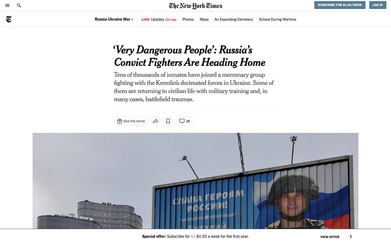 The New York Times опубликовала статью (с выносом на первую полосу) о том, как завербованные в ЧВК "Вагнера" российские заключенные, попавшие на войну в Украине и сумевшие на ней выжить, потом возвращаются к гражданской жизни, создавая угрозу для российского общества.