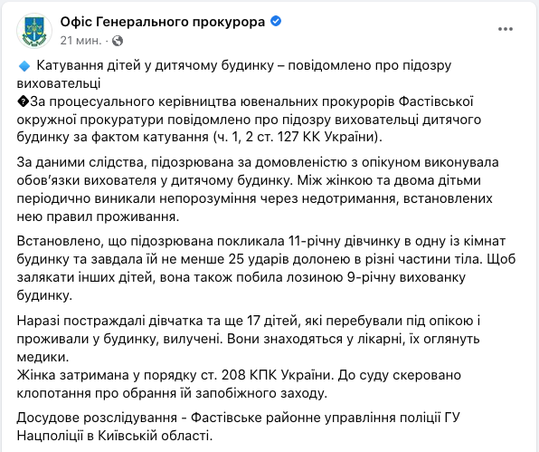 В Киевской области воспитателю детского дома сообщили о подозрении по фактам пыток детей. Вчера стало известно, что на теле 9-летней девочки из детдома под Фастовом нашли резанные раны.