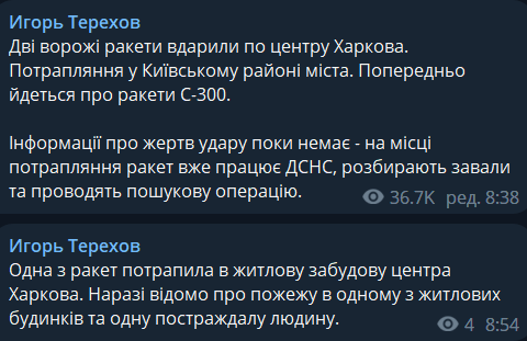 Позже Терехов добавил, что одна из ракет попала в жилую застройку центра Харькова. Сейчас известно о пожаре в одном из жилых домов и одном пострадавшем человеке.