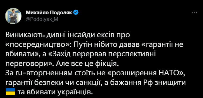 "Возникают странные инсайды эксов о "посредничестве": Путин якобы давал "гарантии не убивать", а "Запад прервал перспективные переговоры". Но все это фикция. За российским вторжением стоит не "расширение НАТО", гарантии безопасности или санкции, а желание России уничтожить Украину и убивать украинцев", - заявил Подоляк.