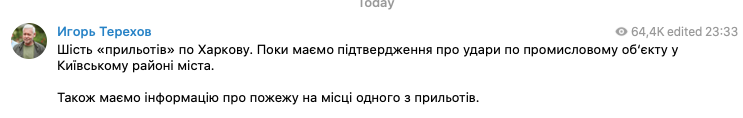 Мэр Харькова Игорь Терехов подтвердил факт взрывов и рассказал о пожаре на месте одного из прилетов.