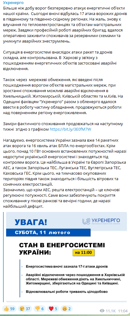 Ранее мы писали, что глава правления НЭК "Укрэнерго" Владимир Кудрицкий заявил, что в субботу и воскресенье, 11 и 12 февраля, в Украине могут не отключать свет по графикам в отдельные часы, несмотря на массированный ракетный удар РФ 10 февраля.