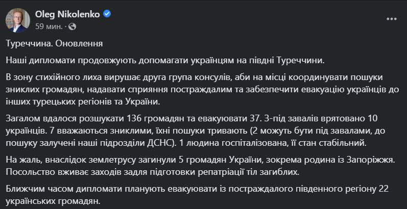 "В результате землетрясения погибли 5 граждан Украины, в том числе семья из Запорожья. Посольство принимает меры по подготовке репатриации тел погибших", - сообщил спикер.