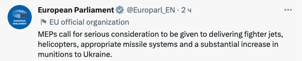 Также Европарламент призывает страны ЕС серьезно рассмотреть предоставление Украине истребителей, вертолетов, необходимых ракетных систем и существенно увеличить поставки боеприпасов.