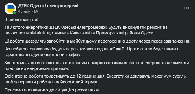 "18 февраля энергетики ДТЭК Одесские электросети будут выполнять ремонт на высоковольтной линии, питающей Киевский и Приморский районы Одессы. Все бытовые потребители будут запитаны от другой линии. Однако свет будет только в гарантированные часы белой зоны графика. Обращаемся ко всем клиентам с просьбой умеренно потреблять электроэнергию и одновременно не включать энергоемкие приборы", - говорится в сообщении.