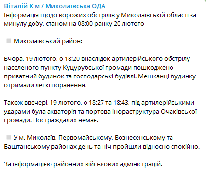 Также, по словам Кима, вечером, 19 февраля, в 18:27 и 18:43 под артиллерийскими ударами была акватория и портовая инфраструктура Очаковской громады.