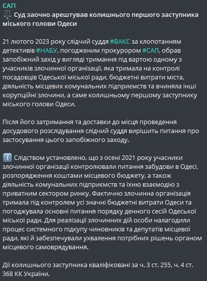 • первом заместителе мэра Одессы, который подозревается по ч. 3 ст. 255 (создание преступной организации) и ч. 4 ст. 368 (получение должностным лицом взятки) УК Украины;