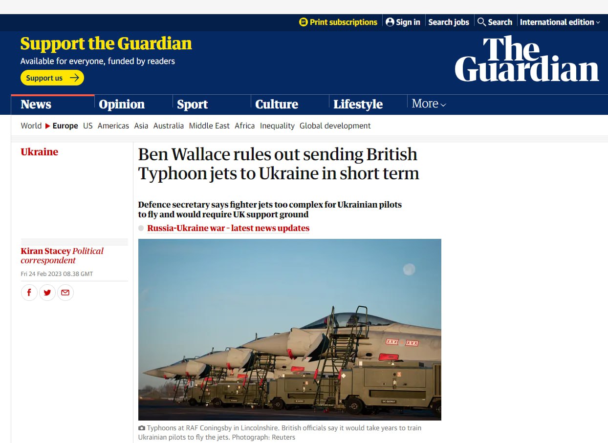 Выступая в пятницу по поводу первой годовщины российского вторжения, Бен Уоллес сказал, что "Тайфуны" будут слишком сложными для полетов украинских пилотов, и для их поддержки потребуется отправить сотни британских военнослужащих на землю.
