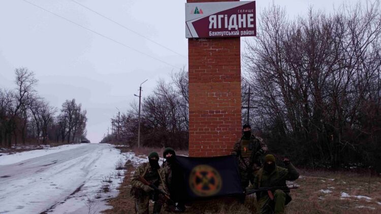 "Вагнеровцы" позируют у въезда в Ягодное. Фото: Telegram