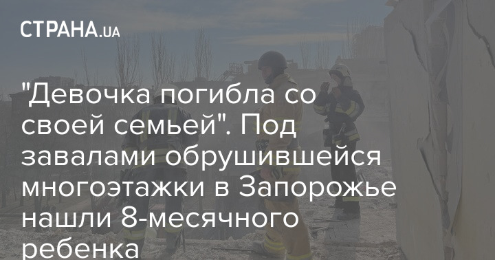 Под завалами дома в Запорожье, разрушенного ракетным ударом, нашли тело 8-месячного ребенка.